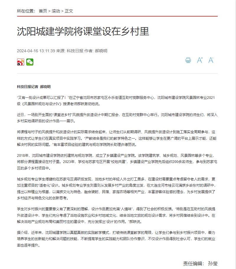 近日,《科技日报》以《沈阳城建学院将课堂设在乡村里》为题,对我校bv伟德国际1946(乡镇建设学院)在辽宁省沈阳市苏家屯区永乐街道互助村党群服务中心举行了“课堂进乡村”风貌提升改造设计中期汇报会进行报道,充分展现了学校以真题真做的实践教学模式,让学生们参与到乡村振兴项目中,着力培养学生的创新能力和解决问题的技能。