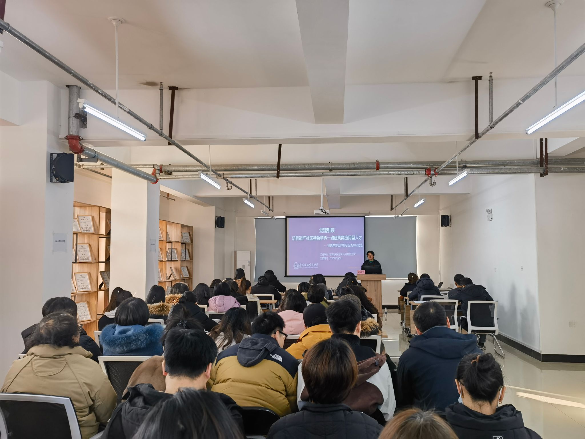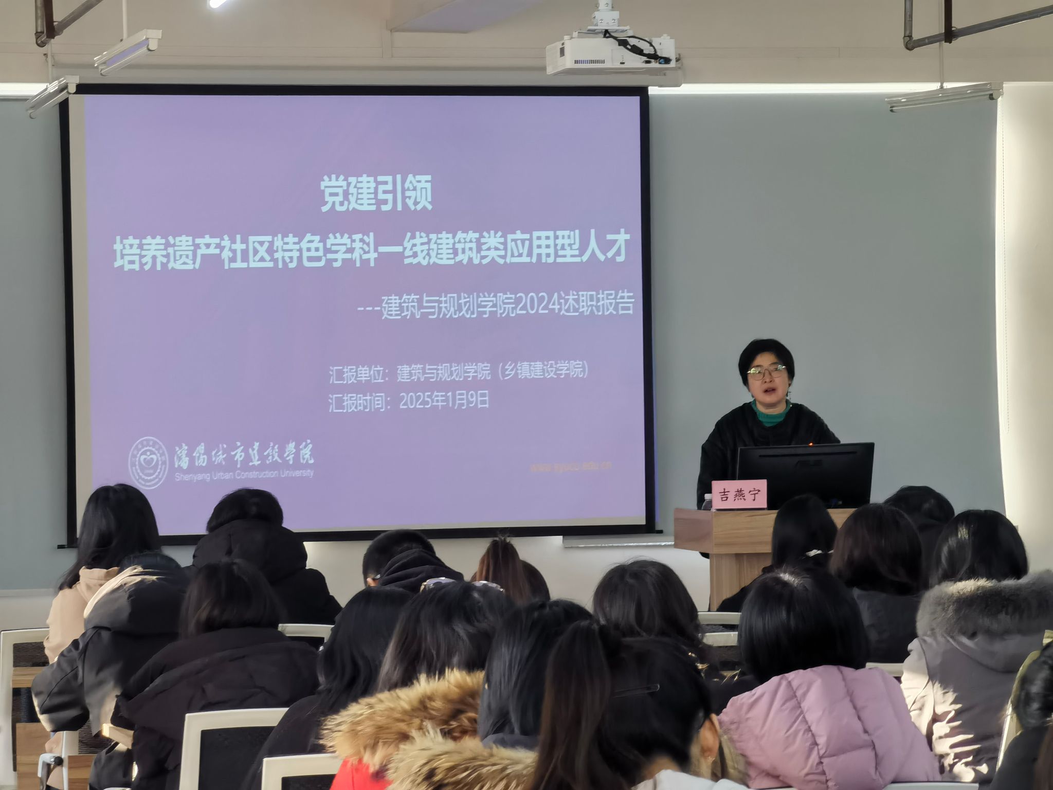 会上,吉燕宁全面回顾并总结了学院2024年的工作。她强调,学院始终坚持党建引领,将立德树人作为根本任务,并稳步推进各项工作,特别是在乡镇建设产业学院、智库、展馆等省级教育与科研平台的建设上取得了显著成果。学院通过深化“五实”“一本两育”教育和“七个一”建筑类应用型人才培养机制,积极推动产教融合与校企合作,不断强化“AI遗产社区”特色学科专业的一体化建设,全方位履行了人才培养、科学研究、服务社会、文化传承创新以及国际交流合作的办学职能。同时,分析了学院当前存在的主要问题,并提出了2025年的主要工作任务和工作思路。
