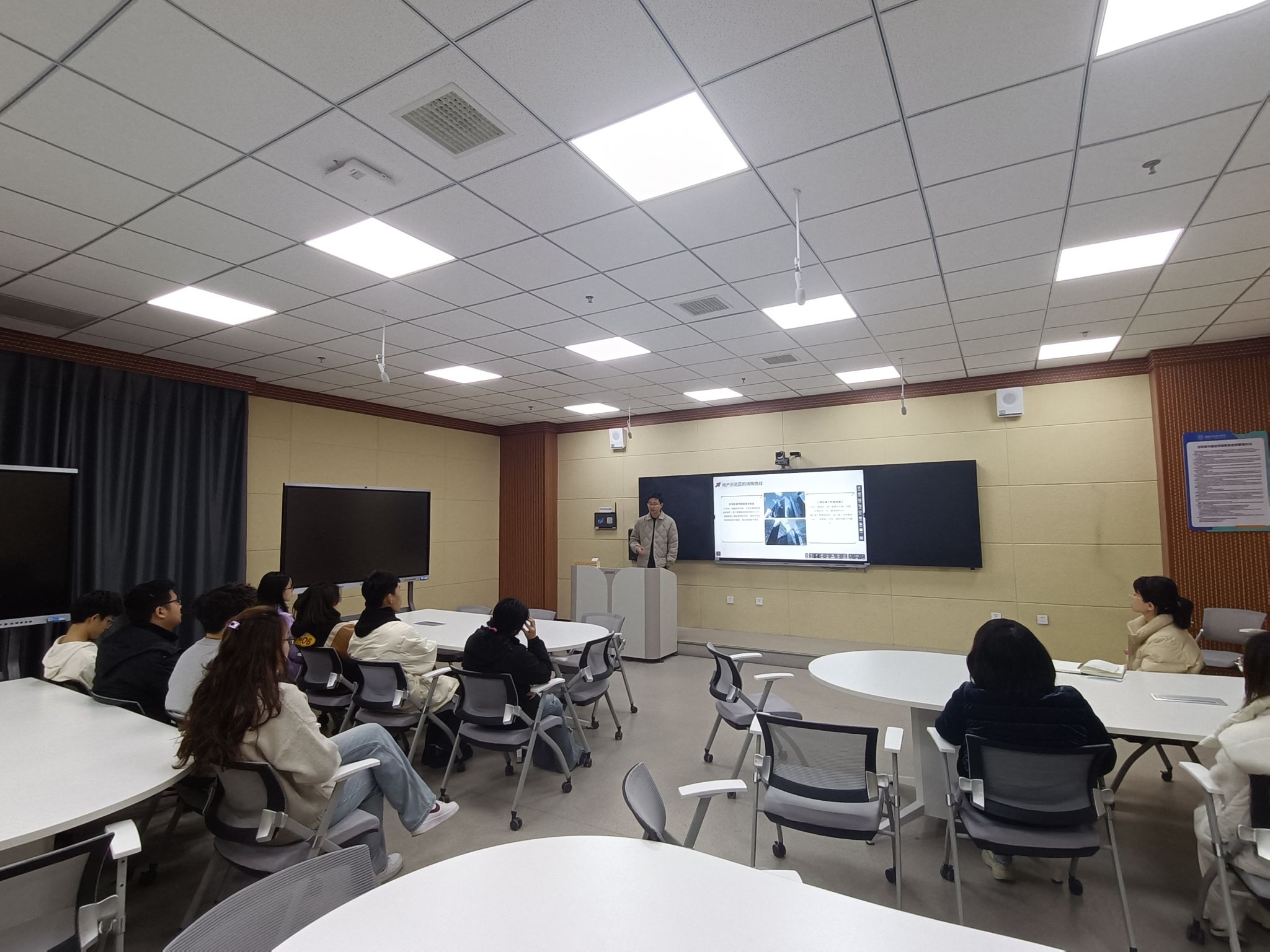 讲座中,李岳霖结合园林施工经验,讲解施工图绘制细节、落地选材和微观处理等内容,并分享大量景观施工案例。讲座结束后,教师代表与李岳霖就行业前沿、人才培养、实训基地建设等话题展开交流。