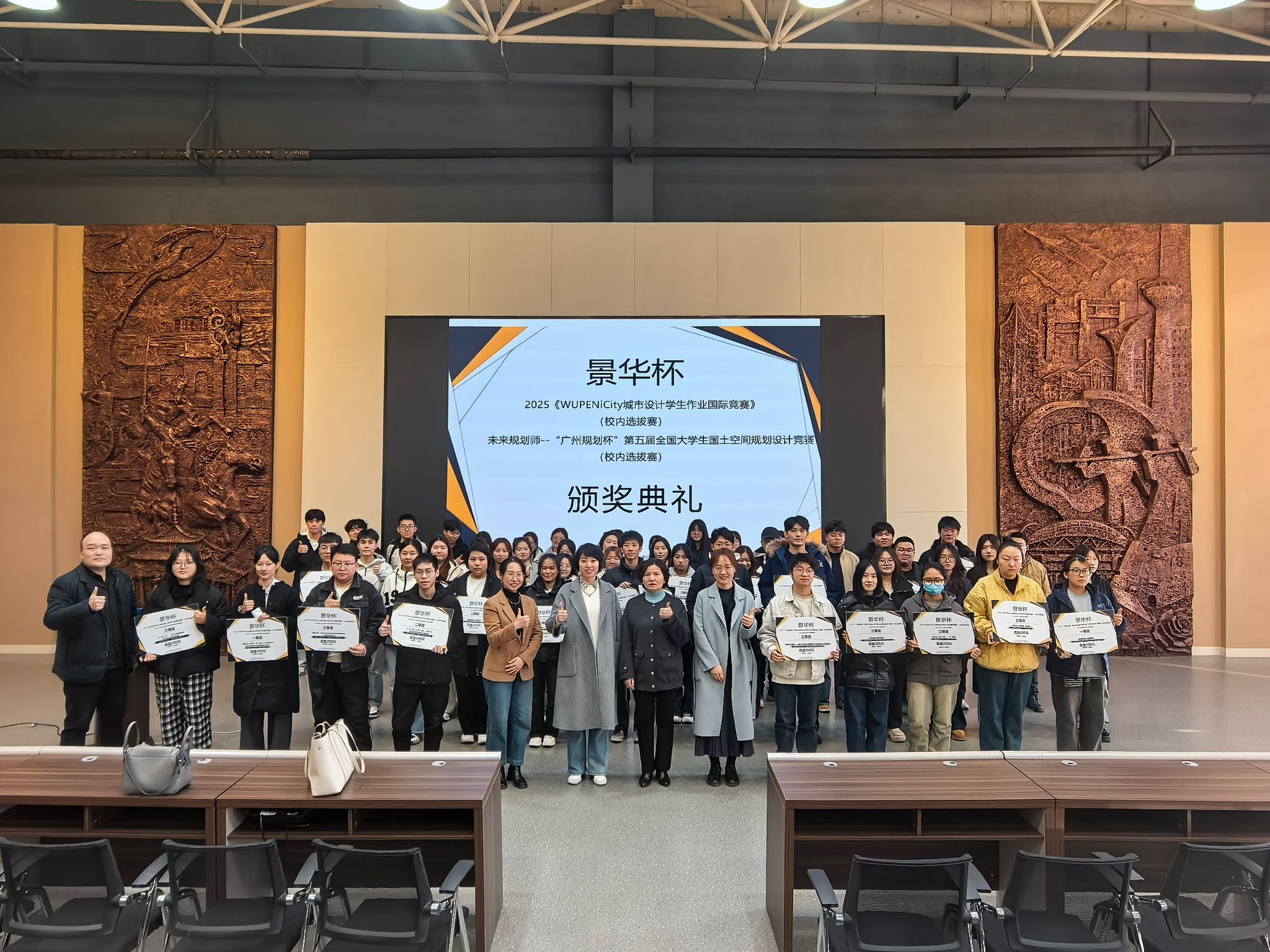 10月21日,bv伟德国际1946在沈阳城市建设展示馆举行景华杯2025《WUPENiCity城市设计学生作业国际竞赛》(校内选拔赛)、未来规划师 ——"广州规划杯" 第五届全国大学生国土空间规划设计竞赛(校内选拔赛)颁奖典礼。辽宁景华工程咨询有限公司总公司副总经理兼沈阳分公司总经理姜琳琳、总公司人力资源部部长栾可欣、沈阳分公司副总经理贺薪竹,bv伟德国际1946院长吉燕宁及 100 余名师生代表共同出席了本次典礼。