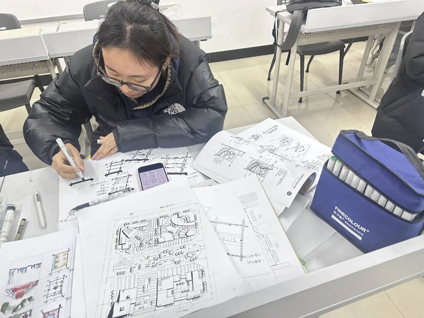 集训采用 “上午理论授课、下午实操训练、晚上答疑辅导” 的教学模式,推动“学、练、评”有序衔接。学院教师团队全程跟进学生学习情况,联合机构结合实际进度灵活调整教学计划,同步开展备考时间规划指导与一对一个性化答疑,及时解答学生备考中的各类问题。为掌握学习成效,集训期间落实作业归档与成绩记录工作,每日布置快题设计、理论论述等针对性作业,教师团队对作业逐一批改、整理存档,为每位学生建立专属学习档案,从完成质量、专业规范等方面进行评价,跟进学习进度。针对学生学习中的共性问题和个性短板,通过集中讲评、专项辅导做好针对性指导,帮助学生查漏补缺、稳步提升。