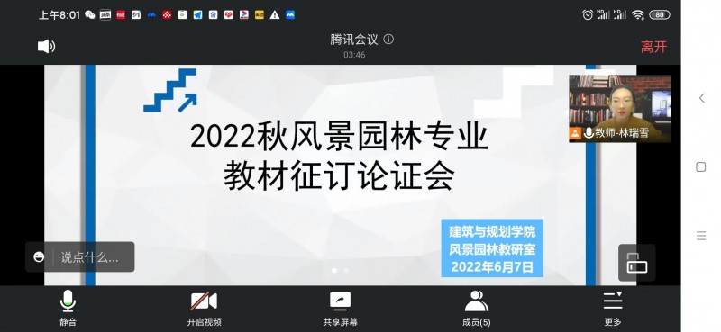 为了加强教材管理和建设水平,规范教材选用程序,加强教材使用过程管理,保证优质教材资源进课堂,切实提高人才培养质量,6月7日,风景园林教研室以腾讯会议形式召开2022年秋季学期教材征订论证会。特聘教授马雪梅作为评审专家出席。会议由风景园林教研室主任林瑞雪主持,教研室全体教师参加了此次会议。