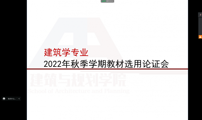 为不断提高学院教材建设水平,推进2022年秋季学期教材征订工作,保证优质教材资源进课堂,切实提高人才培养质量,6月7日,建筑学教研室通过腾讯会议线上召开2022学年秋季教材选用论证会。特聘教授汝军红作为评审专家出席,会议由建筑学专业负责人葛述苹主持,教研室全体教师参加了此次会议。