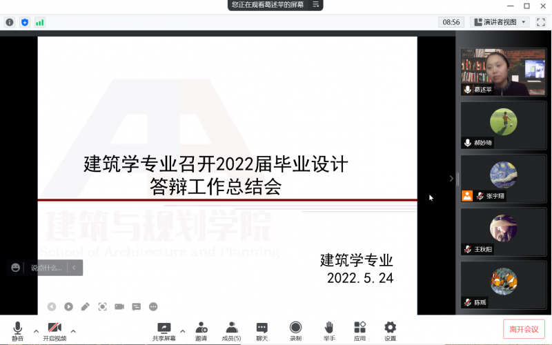 为了进一步加强对毕业设计工作的管理,提高毕业设计质量,5月24日,建筑学教研室以腾讯会议形式召开2022届学生毕业设计答辩工作总结会。会议由建筑学专业带头人葛述苹主持,教研室主任张宇翔、陈瑶及毕业设计指导教师参加了此次会议。