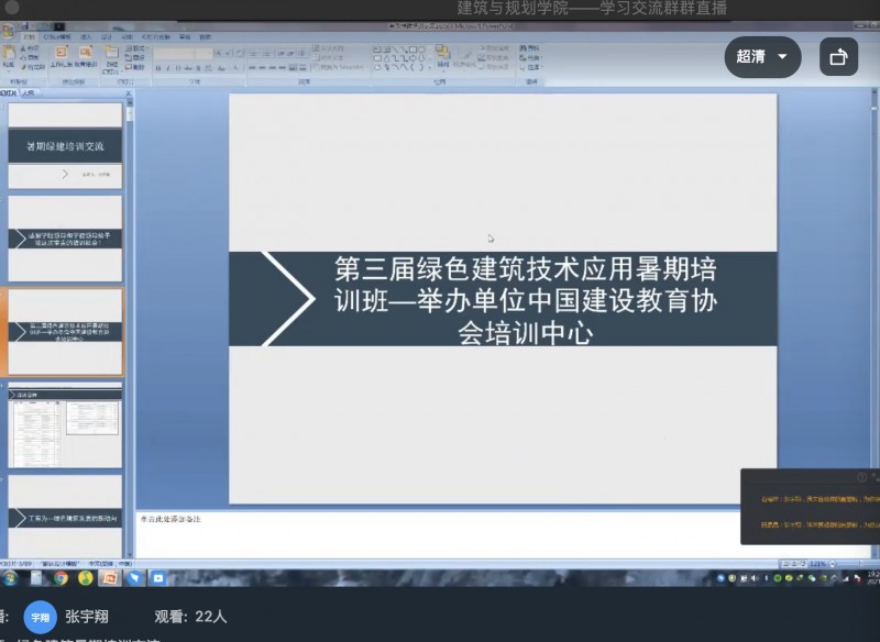 为提高学院教师对绿色建筑技术前沿知识了解,促进建筑学科教育适应行业发展需求,日后更好地开展相关教学和科研工作,8月24日晚,学院以钉钉群直播的形式开展了“绿色建筑技术培训”分享交流会,学院全体教师参加了会议。会议由教师朱林主持,建筑学教研室主任张宇翔对其在暑期参加的“中国建筑教育协会培训中心举办的第三届全国绿色建筑技术应用暑期培训班”的学习内容和心得体会进行了分享。