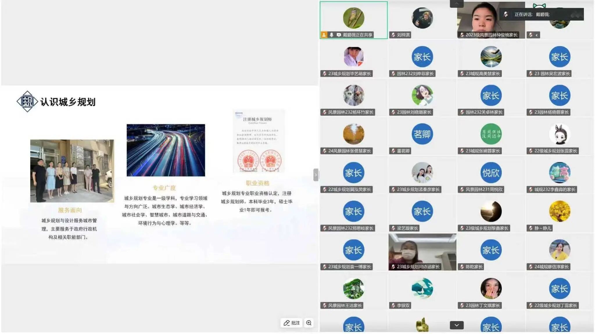 为搭建家校协同育人桥梁,精准对接家长与学生的职业发展期待,共同探讨以升学实现高质量就业的成长路径。10月26日,学院在创新楼101、105智慧教室以“线上+线下”分专业召开家长座谈会。学院党总支书记、副院长牛艺,副院长葛述苹,城乡规划教研室主任郝燕泥、风景园林教研室专任教师郝轶及全体辅导员出席会议,100余名学生家长通过线上或线下方式参会,会议由牛艺与学院团委书记、学生办公室主任陆鹏程分别主持。