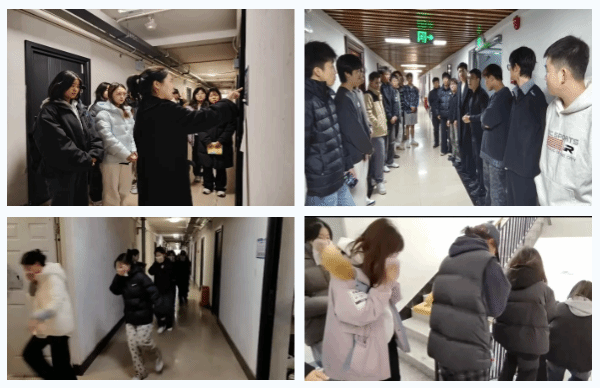 学院以班级为单位,由辅导员牵头组织开展寝室消防安全及逃生自救。辅导员实地走访各楼层安全通道与应急逃生通道,确保每位学生了解寝室楼建筑结构、楼梯分布、疏散通道位置、逃生路线及消防设施配置情况。辅导员组织学生严格遵循 “不拥挤、不慌乱、靠右行” 原则有序疏散,学生们全程积极投入,在实践操作中逐步掌握应急避险的规范流程与实用技巧,在演练中掌握了精准覆盖全体学生,确保消防知识全覆盖。